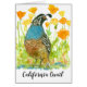 明るいオレンジ色のポピーの花のパッチに立つ飾カラフルの羽を持つカリフォルニアのウズラの鳥とカリフォルニアの州の鳥と州の花のインクと水の色で描は、グリーティングカード。