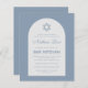 予算バー(ユダヤ教の)バル・ミツバー招待。ほこりっぽい青い背景には、白いアーチが入っており、中に埃っぽい青い文字が入っている。その名は書書書にエレガントある。文字の上にはダビデの埃っぽい青い星がある。