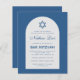 予算バー(ユダヤ教の)バル・ミツバー招待。クラシックの青い背景には、白いアーチに青い文字が入っている。その名は書書書にエレガントある。文字の上にはダビデの青い星がある。