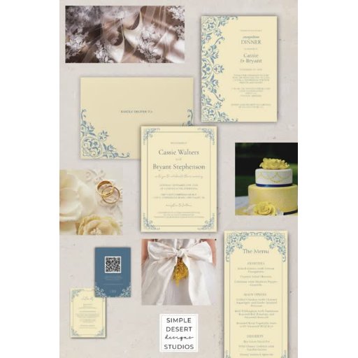 金ゴールドフォイルのアクセントと沿岸のシックで古いお金の美学とデザインの完璧な組み合わせを醸し出すパステルバターイエローダスティブルーミニマル結婚式招待状シンプルは、これらのパステルバターイエローダスティブルーの愛と時間の無い招待状を作成する。多彩なデザインは、スクリプトとタイポグラフィのクラシックの組み合わせと少しレトロなヴィンテージグラフィック要素とのロマンチックなテーマを作成しているカップルに最適である。設計はシンプルDesertデザインスタジオ。お客様の特定の色相カスタマイズに合わせて、より多くの色をメッセージをお送り。