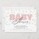 この赤ちゃんシャワーの招待は、赤ちゃん女の子の到着に最適である。デザインは淡いピモダンンクに現れる「ベビー」という言葉を使った見た目で、背景は柔らかいパステル色のドットパターンである。