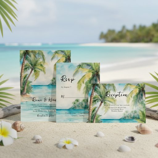 ターコイズ水と美しいビーチを取り囲む緑豊かなヤシの木の島を特徴とするエキゾチックで目を引くナプキンと、これらの結婚式のレセプションやイベントと熱帯touchを追加。KLストックによるアート