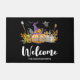 カボチャの家の可愛いイメージを持つ幽霊のよく出るウェルカムドアマットの上に大きな魔女の帽子と幽霊たちとこうもり飛んでいるのまわりに。
