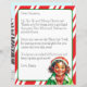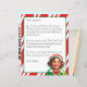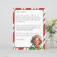 サンタさんからの手紙にパーソナライズされたお子さんの名前を付けて。かわいいヴィンテージの水色レトロな小さな黒い小妖精や小人女の子の笑顔。バックには北極のサインがあり、ライトアップされたクリスマスライトと、サンタと北極からのスタンプが付いた雪の背景がある。キャンディーケーンの背景。