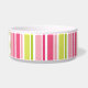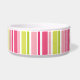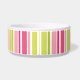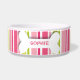 この陶磁器のドッグフードボールは背景でピンク、明るい赤紫色の、緑および白のストライブ柄パターンを備えています。 中間では、ショッキングピンクで書かれるあなたの小犬の容易にカスタマイズ名前の大きく白い骨があります。