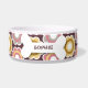 この陶磁器のドッグフードボールは背景の金ゴールド、ピンク、紫色および白であるレトロの花/あるヴィンテージを備えています。 中間では、紫色で書かれるあなたの小犬の容易にカスタマイズ名前の大きく白い骨があります。