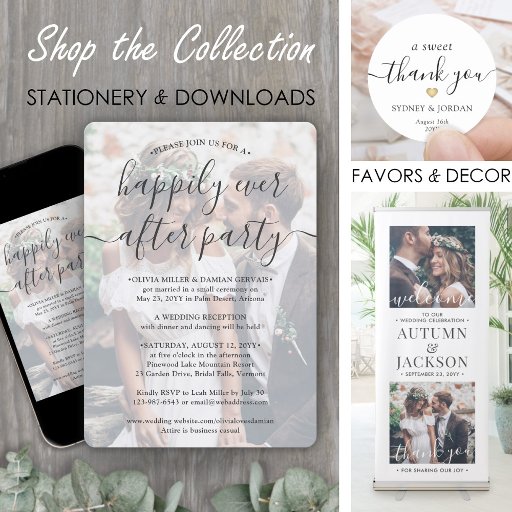 披露宴のみのお祝いの喜びのニュースを発表結婚しユニークてカスタム、パーティーの後に写真オーバーレイ「楽しくEver After招待状」。2つの写真、スキャン可能なQRコード、およびこの招待テンプレート上のすべての用語は、パーソナライズするシンプルためにである。(画像の配置のヒント:写真を正確に中央に配置する簡単方法は、Zazzleウェブサイトにアップロードする前にトリミングする。 カスタマイズ後落成パーティー、誓願の更新式、続編のお祝い、一周年等の結婚結婚のに対応。結婚の日付、場所、Webサイト、または選択したその他の重要な詳細を含める。シックエレガントな白黒デザインは、新婚カップルの2つの写真、トレンディー手書き台本モダン書とタイプライタータイポグラフィを備えスタイリッシュている。QRコードを携帯電話でスキャンすることにより、ゲストは直接のウェブサイトに送信され結婚、そこで重要な詳細をすべて見て、オンラインで接続することができる。このスタイリッシュ発表ノートカードはエレガント、あなたの来る特別な日のお祝いを友人や家族に知らせる方法である。新郎新婦おめでとう!