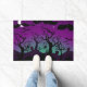 紫とアクアブルーの墓地幽霊のよく出るハロウィーンドルマット。紫色幽霊のよく出るの墓地と墓石、不気味な木、魔女、フクロウ、こうもり、そしてあなたのテキスト"ハッピーハローウィン"と一緒にアクアこのハロウィンデザインの要クール素である。
