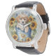 水彩ひまわり子犬、このデザインは、水色で行われるひまわり子犬とバケツでかわいい愛らしい子犬を特徴とする。