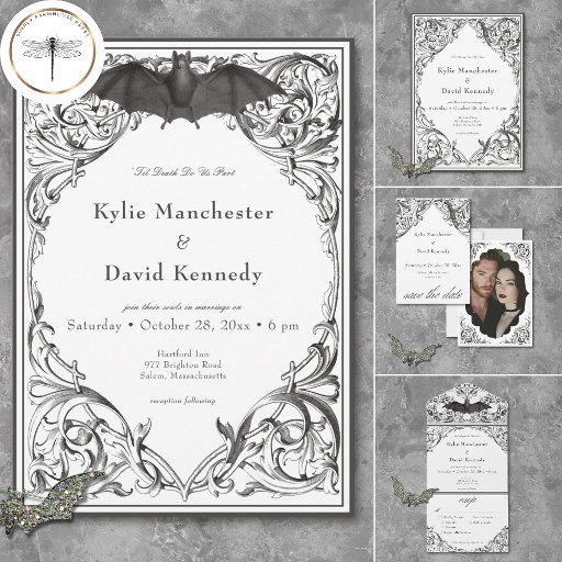 永遠のエレガンスと結婚謎を醸し出す透ビクトリアン明なベルムの招待でゴシックズの価値を高める。アンティーク本綴りに似たデザインのこの素晴らしデザインは黒と白のレースのフィリーグリーを複雑に備え、過ぎ去った時代の魅力を感じさせる。その頂点で、旧世界のこうもりはあなたのお祝いのためのトーンを設定するのに最適なダークロマンスのtouchを追加ユニーク。夫婦の最初のイニシャルは後ろ側にある。「Til Death Do Us Part」という言葉は、編集や変更が可能で、完全に削除することがもしできる。あなたの愛の物語を展開し、あなたの日のように忘れられない招待を開く。Simple Farmhouse Pressによって作成。