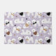 軽い紫色の背景に犬の骨や手の跡が点在する、セーターや弓をまとったかわいいビチョン・フリーズ犬。