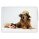 ゴールデン・リトリーバーの恋人のためのSNAPshotzの写真カード。 金に横になることをだらしない麦わら帽子を身に着けている貝殻の隣で特色にしてそれはビーチにむしろいる金ファンのために完全です。