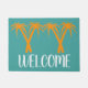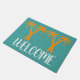 ヤシの木のビーチ夏のテーマウェルカムマットは、ビーチテーマにオレンジ色のヤシの木を取り入れ、青いカスタマイズ可能な色の背景とウェルカムサインを添える。家庭的でビーチの夏の雰囲気のウェルカムドアマットはあなたの家に最適。