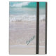 iPadかわいらしスタンド内蔵のエアケース、波打つ波の美しい写真を海岸線に。アクア色のスクリプト文字は、右側に自分のためにパーソナライズする準備ができている素敵なギフトアイディアとして。