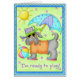 このグリーティングカードのことわざでメッセージを送る遊準備ができている – あなたね。この犬はおもしろいのビーチでビーチのボールと傘で準備ができている。サングラスカッコいい、明るい赤紫色とターコイズのビーチサンダル、オレンジのビーチのティーシャツと紫のビーチの帽子で、彼はスタイルの服を着て行く準備ができている。背景は緑で紫の星と青縁どい。太陽が出て、完璧な日のために輝いている、彼はボールを投げる準備ができている。文字の読下部「準備ができて遊い」。