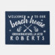 "カヌーのかい、いかり、ヒトデおよびあなたの姓-白の暗い濃紺のフェイクなバーラップの背景の私達のビーチハウスへの歓迎"の文字