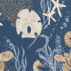 海の中の生き物の水色色彩の鮮やかの豊かな海軍の青い背景には、ウミガメ、サンゴ、ヒトディッシュ、砂ドルと海馬のペアを含む。12インチの大型リピート国際的に認可されたアーティストでデザイナーのオードリー・ジャンヌ・ロバーツ©によるアート。オードリー・ジャンヌのアートワークは、MHSライセンスを通じてライセンスを取得できる。