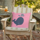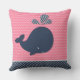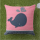 おもしろいビーチまたは海をテーマにした屋外枕は、ネイビーブルーホエー点々のあるル、ネイビーブルーとホワイトホタテのプリントの底とピンクのシボストライプロンの背景にポラカのネイビーブルーとホワイトウォーターの注ぎ口を備え縁どている。