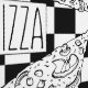 黒と白のチェッカーボードの背景に手で描いたピザのスライスとハーブのパターンを持つ食品をテーマにした壁紙。キッチンやレストランで特設の壁を作るのに最適!