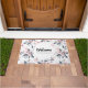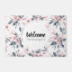 名前の付いたパーソナライズされたウェルカムマット。青エレガント灰色の花と茎のピンクの花の水色のイラストレーションで作られたパタ離れーンでデザイン。上に白い円を重ね、テキストを内側に配置。