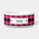 ドッグボウルでドッグの個性とデカールをコーディネート!黒いガーリーバッファローのプレイドがこの犬のボパーソナライズされたールの背景。あなたのペットがどれほど愛されているかを強調する小さなハートの間にあなたのペットの名前を追加する。