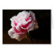 独身のなピンクのカーネーションのつぼみは暗い背景に対して、撮影されます。 著しく美しい、この花の写真は明るい暗い赤紫色に最も淡い色のでクリーミーな白およびピンクの色合いを特色にするしわを寄せられた花びら詳しく捕獲します、および開花を。