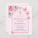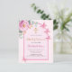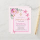 赤面ピンクの背景とアーチ。ピンク飾のフローラ、バラの花、緑の水色のユーカリの緑と蝶。名前と詳細のパーソナライズおよび追加背面:赤面ピンクの背景色。1枚= 1枚の招待状を印刷したエッジからエッジ