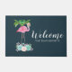 Welcomeという単語と名前の組み合パーソナライズされたわせ。ピンクのフラミンゴのイラストレーションがフローラの多肉質の花のベッドに立ち、緑のヤシの木が後ろで揺れている。トロピカルとかわいらし。背景は紺色。