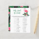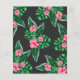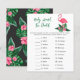 赤ちゃんシャワー招待デザインは、緑豊かな緑のヤシの葉の葉の葉と熱帯ハイビスカスの花とピンクのフラミンゴを特徴とする。「アロハベビー」。黒い背景色のトロピカルフローラルパターンがカードの背面に着く。