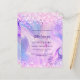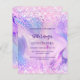 キンセガーリーーニフェミニンェラの招待。前面:紫、ピンクのホログラフィック色の背景。飾赤面の紙吹雪名前とパーティー・詳細のパーソナライズおよび追加名前は手書文字のスタイルと紫の色の文字です。1枚= 1枚の招待状を印刷したエッジからエッジ