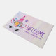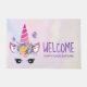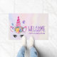 ウェルカムドアマットはトレンディーピンクのユニコーンで設計。フローラのヘッドピファンシーースで飾られた。お洒落のまわりに飛んでいる蝶。紫淡い色のと黄色の水色の背景。