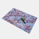 春にピンクの花を咲かせる桜の木の枝からぶら下がっている、ヨーロッパ青いタイガーの鳥、Cyanistes caeruleus。美しい鳥の写真は、Katho Mendenによって撮影されました。このウェルカマットは、自然愛好家へのギフトアイデアとして最適です。