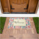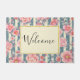 青とクリーム色ので構成されたパターかわいらしンの上にピンクの花を重ねストライプのた美しいパターンのウェルカムドーストライプマット。