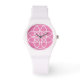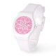 ピンクかわいらしの背景に白いスパイラルサークルを描いた時計。by celeste@khoncepts.com