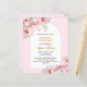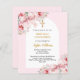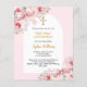 白いアーチフレームとライトポイントの背景。ピンク飾の花とピンの弓を持つ。黄金の十字架。名前と詳細のパーソナライズおよび追加1枚= 1枚の招待状を印刷したエッジからエッジ