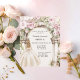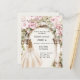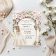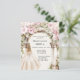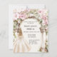ピンクの花模様を持飾つ大きな大理石のアーチ。白いドレスを着たブロンドの女の子。1枚= 1枚の招待状を印刷したエッジからエッジ