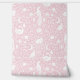 魔法の白鳥のプリンセス、カエルの王子、ネコ、ムーン、スター、魔法豆、カボチャ、鍵、ネズミ、梨、トートオールなどの手描きイラストを備えた魅力的な壁紙デザイン。この魅力的なお洒落壁のデコ来アには、人生の美少女のイメージは、ベッドルーム、子供部屋や遊び部屋に最適。甘いピンク色の背景にイメージが白い。