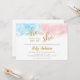 ピンクとブルーの水色の背景に金ゴールドフェイクグリッター書道文字を備えた横型の男女別リビールカラーパーティの招待状。このおもしろいと招待モダンを性別でカスタマイズして、パーティー情報を表示する。