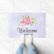 美しい水色のウェルカムドアマットエレガントは、フローラブーケを作成した。薄緑の葉に囲まれたピンクの庭の花。紫色の水色の背景。