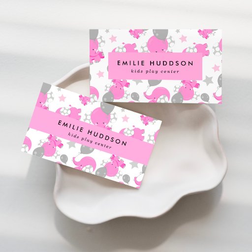 ピンクの象や風船、星を持つ可愛くておもしろいで愛らしい名刺。そしてモダントレンディーデザイン、完璧なセ子供へン遊ト、遊び場、アクティビティの中心、子ども、気にbabysitter、nannies。