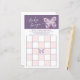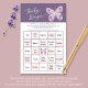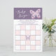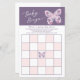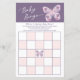 ベビービンゴベビーシャワーゲームカードフローラバタフライテーマのピンク、プリン、およびブルース。ゲームのルールだけでなく、トップ文字ラインをパーソナライズ。グリッドの正方形の色縁どと、背景と文字は全て変更できる。© Kimbeluated, LLC