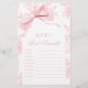 コケエレガントットをテーマにしたベビーガールシャワー用にデザインされた洗練された「ベビー言葉スクランブル」ゲーム。ボヘミ魅力的アンアーチにピンク色の手描き弓を、背中にピンクのフローラヴィンテージパターンを特徴とし、このクラシックゲームはあなたのイベントにタイムレスなスタイルとおもしろいのtouchを追加する。お客様を楽しませたり、大切な思い出を作り出したりするのに最適な、甘くて赤ちゃんのシャワーお祝い名門私立校風のに理想的な追加。回答: 1.おむつ2. rattle 3. pacifier 4. formula 5. pregnancy 7. stroller 8. car seat 9.ボトル10.子供部屋