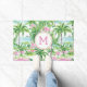 ピンクとモノグラムのグリーンのトロピカルパームの木の模様が名門私立校風の可愛いドアマット。好きなイニシャルでモノグラムをパーソナライズ。