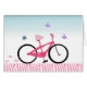 ホットピンクのシートとフレーム、黒のペダル、黒のタイヤを備えたピンクの自転車を搭載した可愛いデザイン。柔らかい青の背景に小さな青い蝶が周飛んでいるりを。