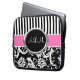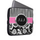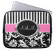 このシックで黒く、白い、およびピンクのストライプのな花のダマスク織のラップトップスリーブはあなた自身の名前、イニシャル、商号、または他の文字とカスタマイズべきあなたのためのテキスト・ボックスを備えています。 カスタマイズ助けを必要としたらniteowlstudio@gmail.comに電子メールを送って下さい。