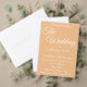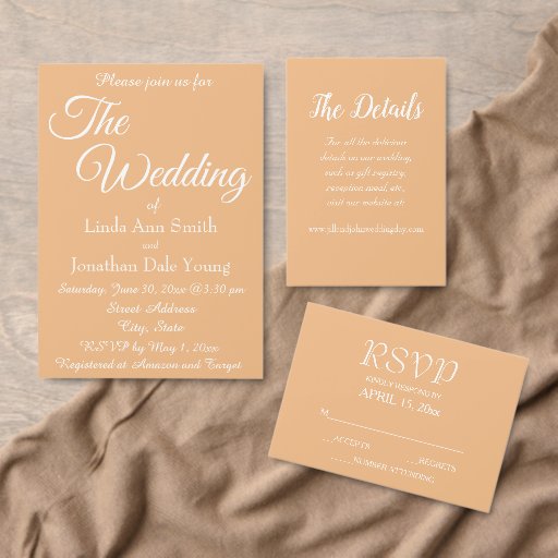 トレンディーシンプル、桃の色の背景、将来の新郎新婦の名前とイベントの日付、時間、場所、および白い様式化されたスクリプトで印刷されたレジストリを特徴とする結婚式招待状スタイル。情報を独自の結婚式招待状に置き換えることによって、情報をパーソナライズする。招待紙スタイルと数量を選択する。当社のピーチスタイルのコレクションとシンプル連携す結婚るように設計。