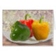 ピーマンの緑、黄色と赤は、調理する準備ができている白いプレートの上に座っている。オリジナルはKathie Millerによるミニチュア油彩画