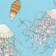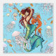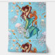 赤毛の人魚の金ゴールドジュエリー。人魚はティール(緑がかった色)で青と緑の尾を持つ。人魚のまわりには、青い海を背景に海の馬、クラゲ、貝、水の泡である