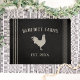 この素朴な農家のスタイル様式で魅力的、あなたの家にゲストを歓迎。デザインパーソナライズされたは、ニュートラルtanレタリングであなたの家族の名前やファーム名を特徴とあなたの年を確立し、鶏のイラストレーション。豊かな黒ストライプい背景にロープの詳細は、デザインを完了する。