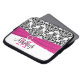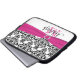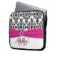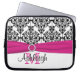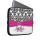 フェイクなリボンおよび宝石のブローチが付いているこの名前入りな白く、黒いおよびショッキングピンクのダマスク織のラップトップスリーブはあなた自身の名前、モノグラム、商号、または他の文字とカスタマイズべきあなたのためのテキスト・ボックスを備えています。 カスタマイズ助けを必要としたらniteowlstudio@gmail.comに電子メールを送って下さい。
